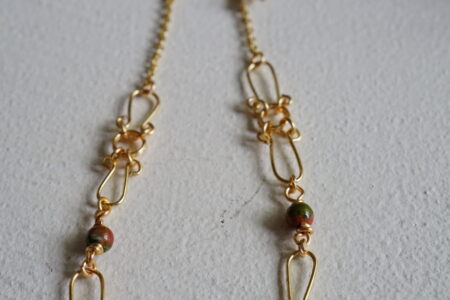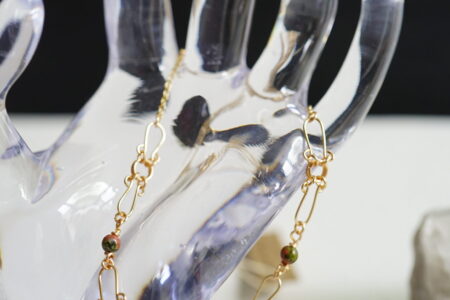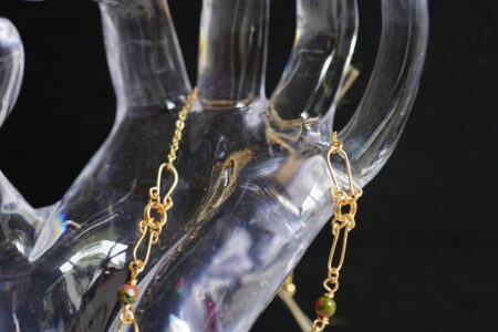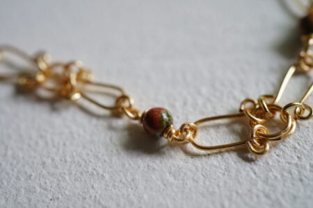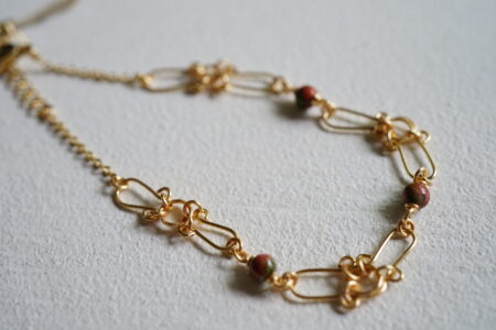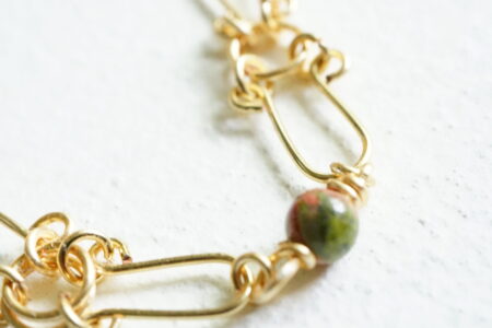 ユナカイトのかわいらしいビーズをワイヤーアートと組み合わせ、美しいブレスレットに仕立てました。